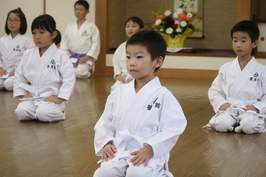 探検が終わったら、立ち方や正座、手の握り方などをやりました。突きや受けもやりましたね。それにしてもみんなの真剣な顔がかわいい!